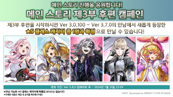 또한, 메인 스토리 제3부 후편을 진행하면 Ver 3.0.100 ~ Ver 3.7.0까지 몽견에서 등장한 ★5 캐릭터 1명과 반드시 만날 수 있는 캠페인 및 로그인 보너스 증량 캠페인을 개최 중이다.