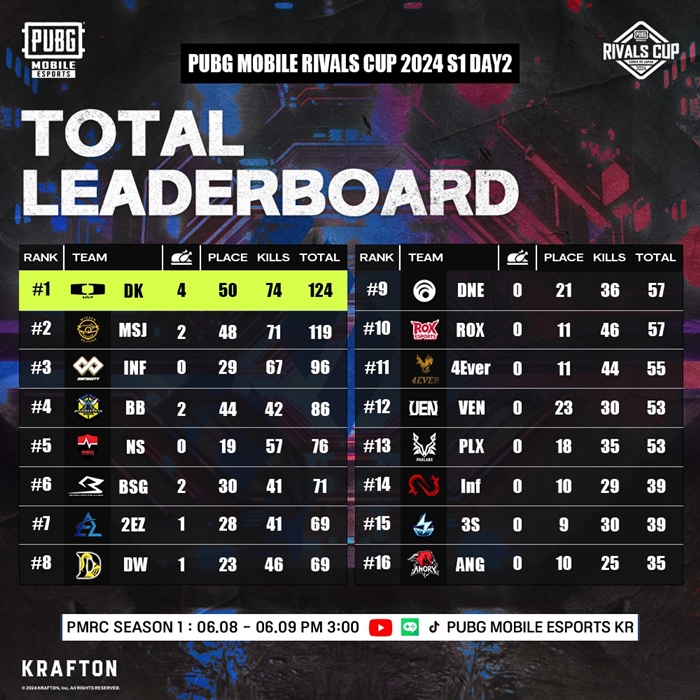 한국에서는 ‘배틀그라운드 모바일 프로 시리즈(PUBG MOBILE PRO SERIES, 이하 PMPS) 2024’ 시즌 1 우승팀인 DRX가 PMWC 진출을 확정한 가운데, 2위부터 9위까지의 8개 팀이 이번 PMRC에 참가했다.