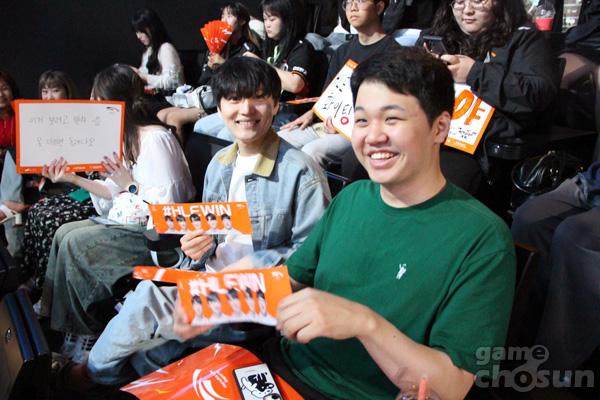 한화생명e스포츠의 전신인 락스 타이거즈와의 인연으로 경기를 관람하러 온 와치(조재걸 선수)와 프레이(김종인 선수) = 게임조선 촬영