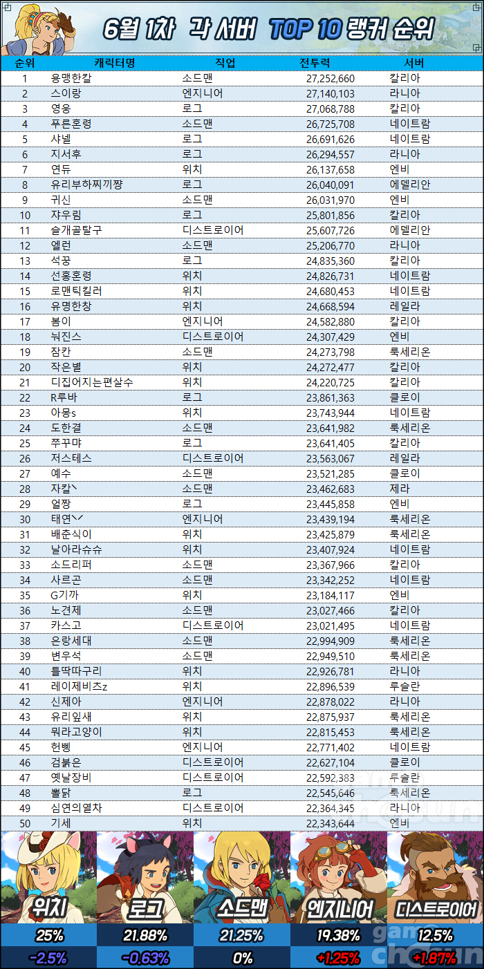 각 직업별 최고 순위 달성자와 순위는 다음과 같다. 소드맨은 칼리아 서버 용맹한칼이 1위, 엔지니어는 라니아 서버 스이랑이 2위, 로그는 칼리아 서버 '영웅'이 3위, 위치는 엔비 서버 '연듀'가 7위, 디스트로이어는 에델리안 서버 '슬개골탈구'가 11위다. 지난 랭킹에서 잠시 디스트로이어 1위를 내주었던 슬개골탈구가 다시 디스트로이어 정상에 올랐다.