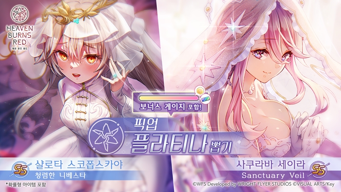[자료제공 = 라이트 플라이어 스튜디오] 라이트 플라이어 스튜디오 × Key가 선사하는 드라마틱 RPG '헤븐 번즈 레드'가 2024년 6월 14일(금) 11:00부터 6월의 신부 캠페인을 개최한다. 최대 쿼츠 3000개를 획득할 수 있는 '6월의 신부 로그인 보너스' 및 신규 의상 SS 사쿠라바 세이라, SS 샬로타 스코폽스카야가 등장하는 '픽업 플라티나 뽑기'를 개최한다.