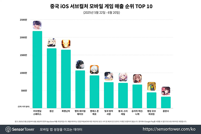 '니케'는 서브컬처 게임 기준으로 중국 iOS에서 매출 8위에 올랐는데요. 상위 10개 게임 중 유일하게 중국이 아닌 해외에서 개발된 게임으로, 현지 시장에서의 의미 있는 성과를 보여주고 있습니다.