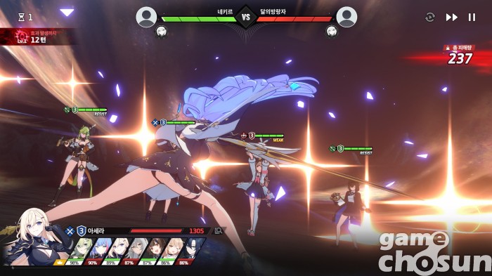 예를 들면 4인 파티 턴제 전투가 그렇다. 일반 공격, 특수기, 궁극기를 가진 캐릭터 4명을 한 파티로 구성해 적과 턴을 주고받으며 전투한다. 상성 속성으로 적을 공격하면 강인도를 깎아 취약 상태로 만들 수 있고, 강인도를 깎을 때마다 브레이크 포인트를 모아 강력한 브레이크 스킬을 사용할 수 있다.