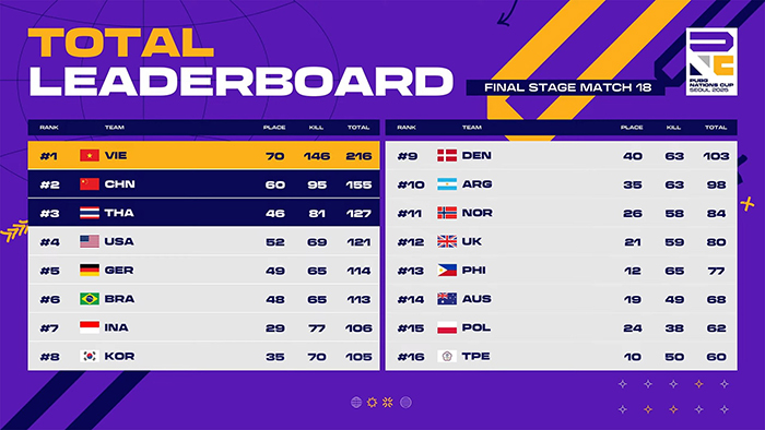 지난해 배틀그라운드 e스포츠 최상위 대회인 ‘펍지 글로벌 챔피언십(PGC) 2024’ 우승팀 ‘디 익스펜더블스(The Expendables)’ 소속의 ‘탄부(TanVuu)‘ 쩐 딴 부 선수, ‘델윈(Delwyn)’ 까오 꽝 응우옌 선수, 그리고 지난해 베트남 프로팀 '케르베로스 e스포츠(CERBERUS Esports)' 소속으로 국제 무대에서 돌풍을 일으킨 ‘히마스(Himass)‘ 라 프엉 띠엔 닷 선수와 ‘솔로지(Sololzy)’ 르엉 응옥 히엔 선수가 고른 활약을 펼쳤다.