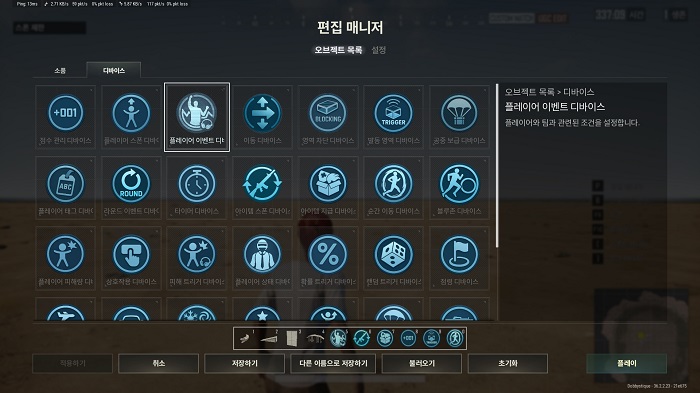 사실 디바이스의 로직은 제대로 설정하지 않으면 작동이 되지 않는다. 세부적인 가이드가 아직까지 존재하지 않는 만큼 디바이스의 로직 연결 및 작동에 대해 초반에는 큰 어려움을 겪었다. 다행히 '불러오기'에서는 UGC 알파에서 지원하는 모드의 샘플을 로드할 수 있는데, 해당 샘플에서 자신이 제작하고자 하는 모드의 디바이스 작동 로직을 참고하는 것이 가능했다.