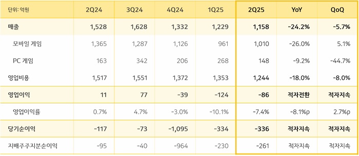 카카오게임즈는 2025년 2분기 매출액 1,158억 원, 영업손실 86억 원을 기록하면서 전년도 대비 적자전환, 분기대비 적자지속을 이어갔다.