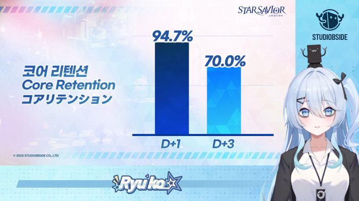 연속으로 접속한 비율, '코어 리텐션'은 D+1이 94.7%, D+3이 70%다. CBT는 보통 데이터가 이어지지 않기 때문에 코어 리텐션이 낮은데 스타세이비어는 굉장히 높은 수치를 달성했다고 밝혔다. 보통 서브컬쳐 게임의 CBT 리텐션 평균치는 D+1이 30~40%일 경우 보통, 40~50%는 좋은, 50%~은 매우 높음으로 판단하며, D+3는 15~25%가 평균, 25~30%은 좋은, 30%~는 충성층을 보유한 것으로 판단한다고 밝혔다.