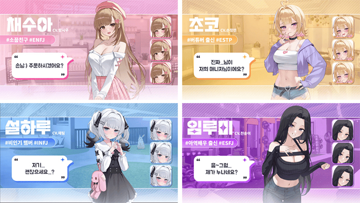 이 게임은 주인공이 4명의 걸그룹 미소녀의 매니저가 되어 때로는 애틋하고, 때로는 엉뚱한 매력을 엿볼 수 있는 비주얼 노벨 게임이다. 라이브 2D로 구성된 미소녀들의 다양한 애니메이션이 강점이다. 또 대화 스크립트의 크기, 속도, 투명도 등을 조절할 수 있고, 다크 모드와 보이스 설정 등 플레이어들의 편의성 기능도 다양하게 설정할 수 있다.