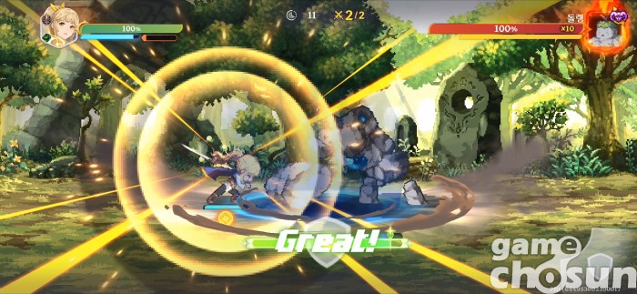 픽셀 아트와 함께 눈길을 끄는 부분은 전투다. 가디스오더는 벨트스크롤 액션 방식에 방어와 회피, 그리고 링크 교대를 넣어 차별화를 꾀했다.