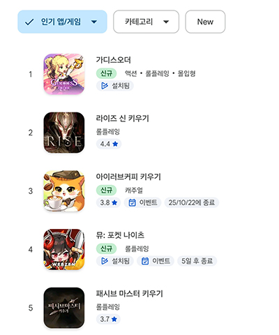 카카오게임즈가 서비스하고, 픽셀트라이브가 개발한 모바일 실시간 태그 액션 RPG '가디스오더'가 구글 플레이 스토어에서 인기 순위 1위를 기록했다. 9월 24일 정식 출시 이후 하루만이다.