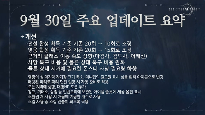 뿐만 아니라 아이템 및 제작 재료 드랍률, 골드 획득량을 높이고, 파티 던전 보상 상향, 희귀 제작서 조각 수급량 증가를 늘려가는 것은 물론 희귀 제작서 합성 확률을 대폭 상향하여 앞으로는 희귀 장비를 쉽게 얻을 수 있도록 할 것이며, 영웅 제작서 합성 확률도 점진적으로 높여갈 계획임을, 현재 별의 낙원에서 드랍하는 패시브 스킬 드랍률을 상향하고, 종류도 늘려갈 것이라고도 언급했다.
