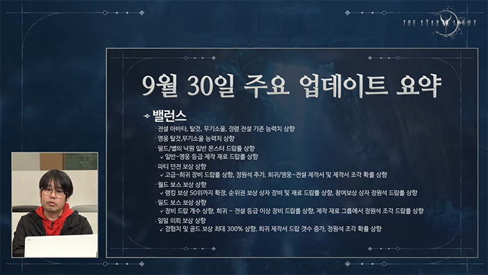 방송은 박경태 기획부장(시스템 파트), 이도현 기획부팀장(전투 파트), 박재훈 수석(밸런스 파트) 3인의 진행으로 시작됐다. 방송 초반 박경태 기획부장은 더 스타라이트를 즐기는 유저들에 대한 감사의 말과 함께 또, 서비스 초기 많은 불편을 겪었을 유저들에게 직접 사과의 말을 전하고 싶었다고 운을 뗐다.