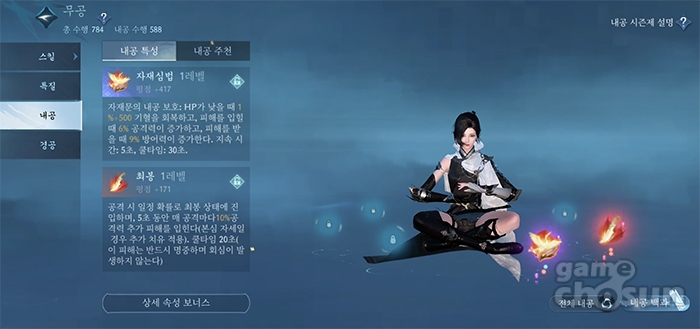 내공은 일종의 패시브 스킬이자 특정 무공에 부가적인 효과를 부여하는 심법으로 구성되어 있다. 내공은 성장에 따라 성능이 향상되고, 새로운 속성을 획득하기도 한다.