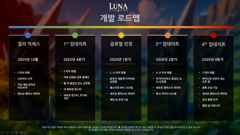 또한 '루나'의 서비스 방향성과 출시 이후 콘텐츠 확장 계획을 담은 공식 로드맵을 스팀 페이지를 통해 공개했다. 로드맵에는 신규 지역, 협동 콘텐츠, 전투 모드 확장 등 향후 업데이트 일정이 포함돼 있어 글로벌 유저들의 기대를 모으고 있다.