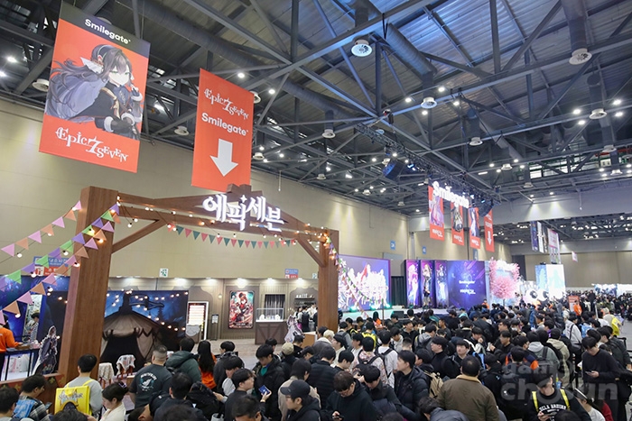 올해 스마일게이트관은 ‘에픽세븐’과 ‘미래시: 보이지 않는 미래(이하 미래시)’의 두 개 IP로 꾸며졌다. 특히, 에픽세븐과 미래시는 세계관을 공간 연출과 장치물로 세밀하게 구현해 방문객들의 눈길을 사로잡았다. 여기에, 누구나 쉬어갈 수 있는 ‘리프레시 존’을 별도 구성하고 메인 무대에서는 인기 성우와 인플루언서, 코스프레 모델이 참여하는 다양한 이벤트를 연이어 선보였다.