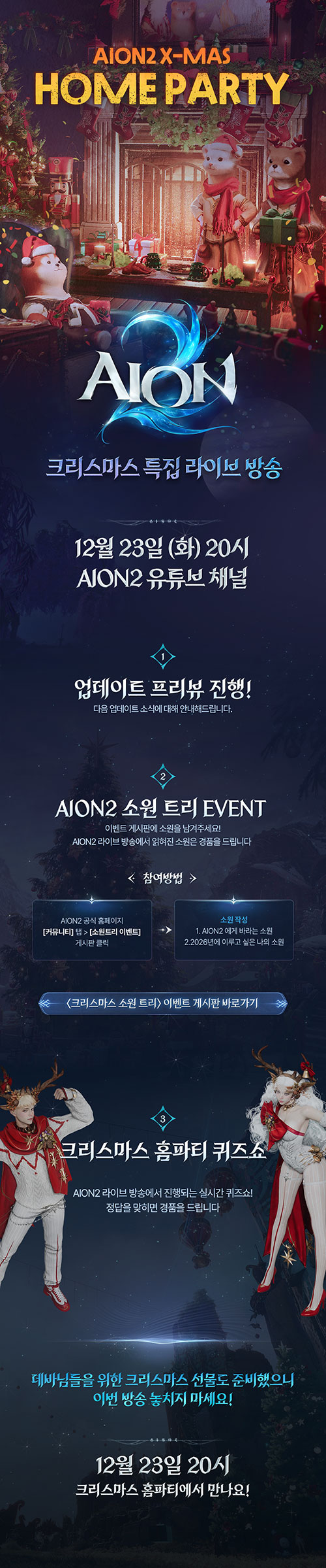 크리스마스 시즌을 기념해 진행되는 이번 방송은 '업데이트 프리뷰'는 물론 '아이온2 소원 트리 이벤트', '크리스마스 홈파티 퀴즈쇼'와 같은 다채로운 프로그램이 진행될 예정이다.