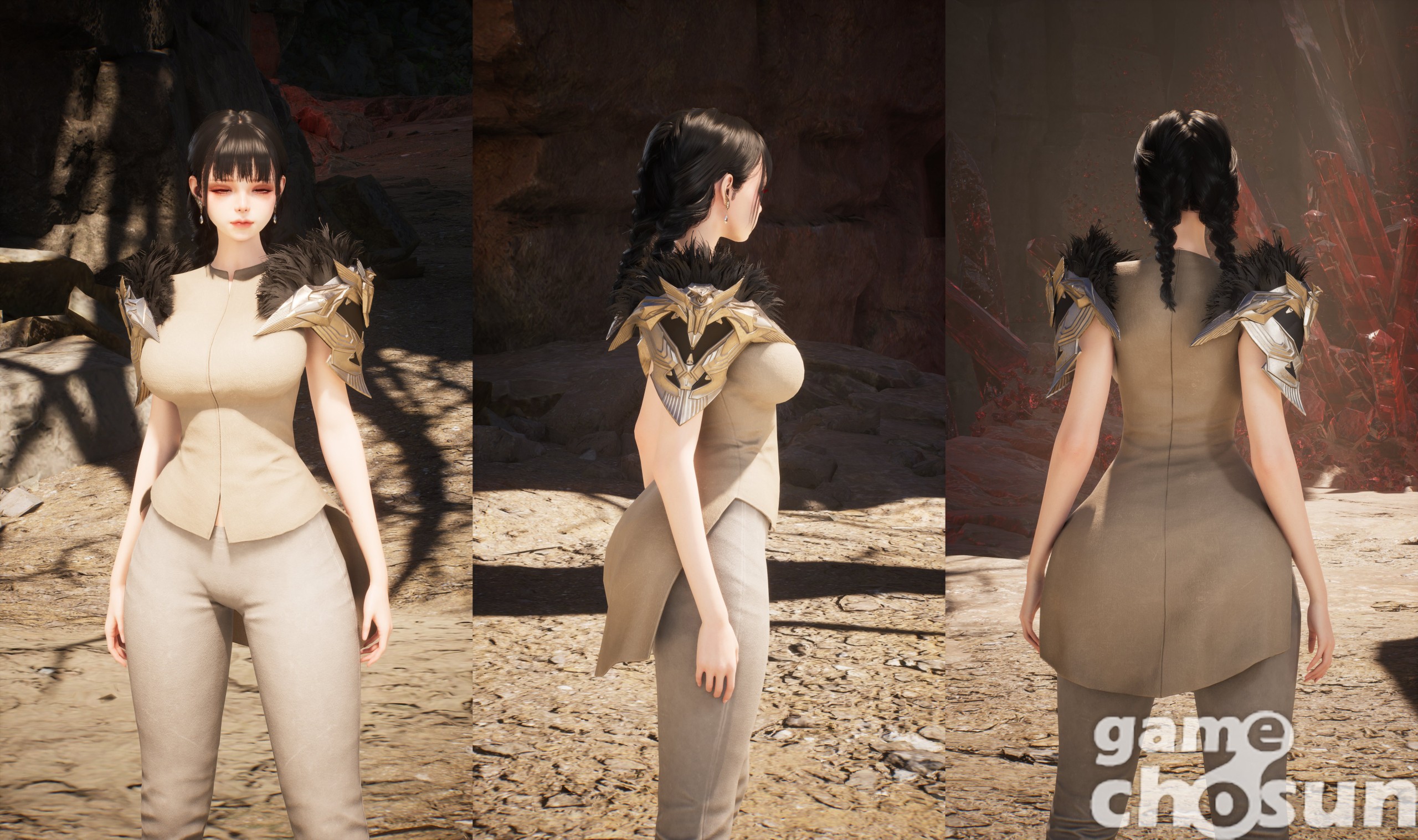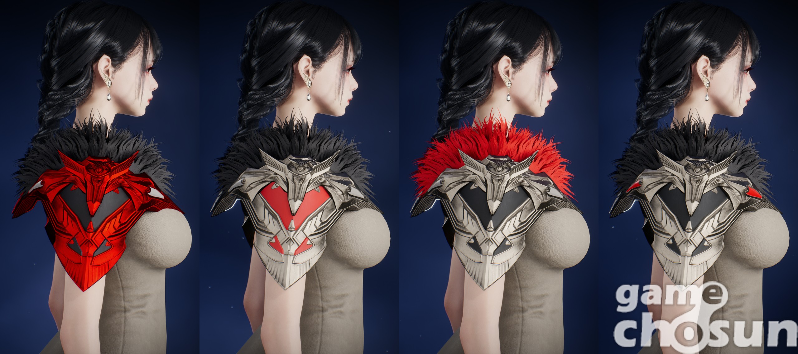 커다란 크기와 풍성한 털로 다른 의상과 조합하기 까다로운 어깨다. 천옷과 조합은 어색하지만, 갑주와 조합했을 땐 상체 볼륨을 강조할 수 있는 점이 매력적.