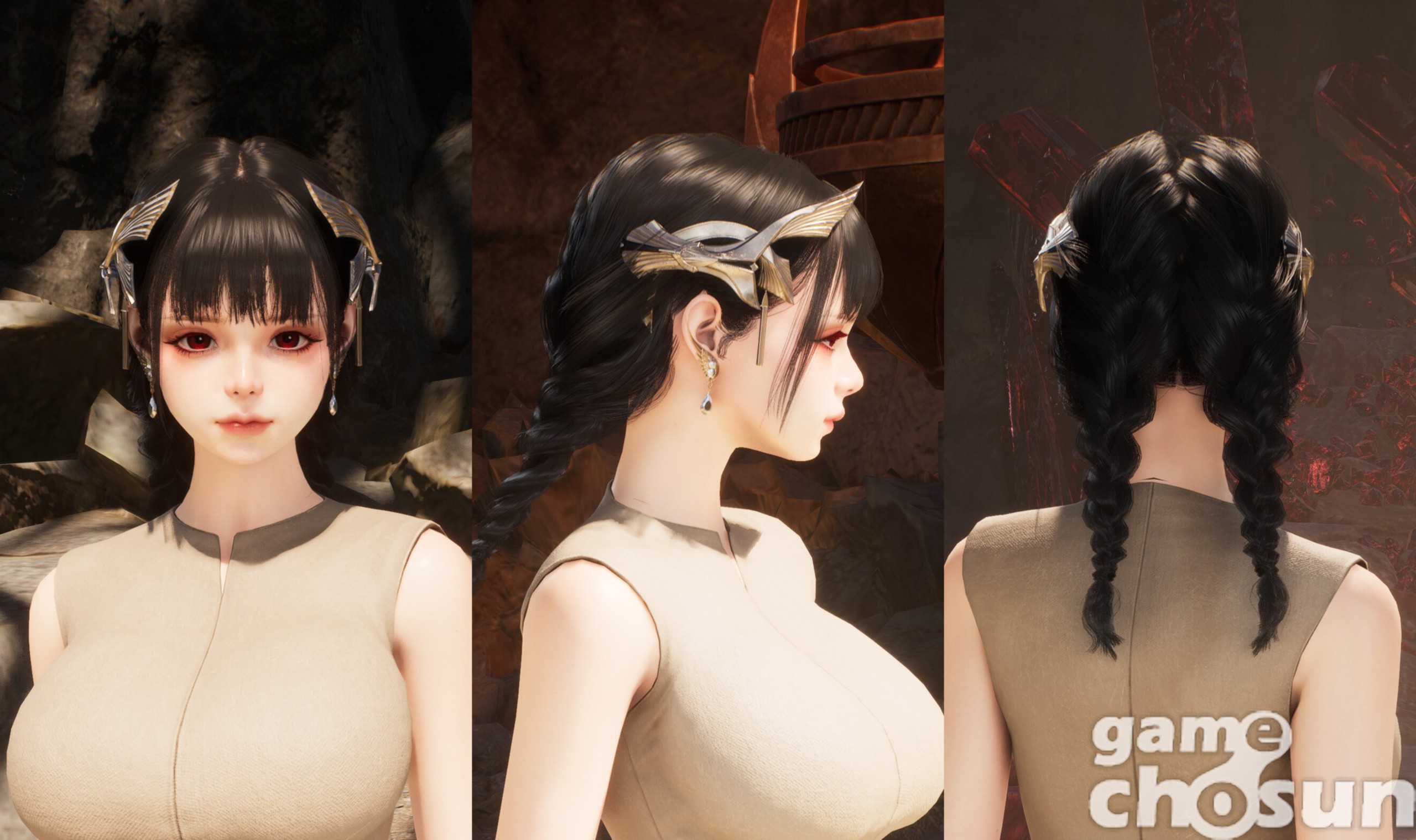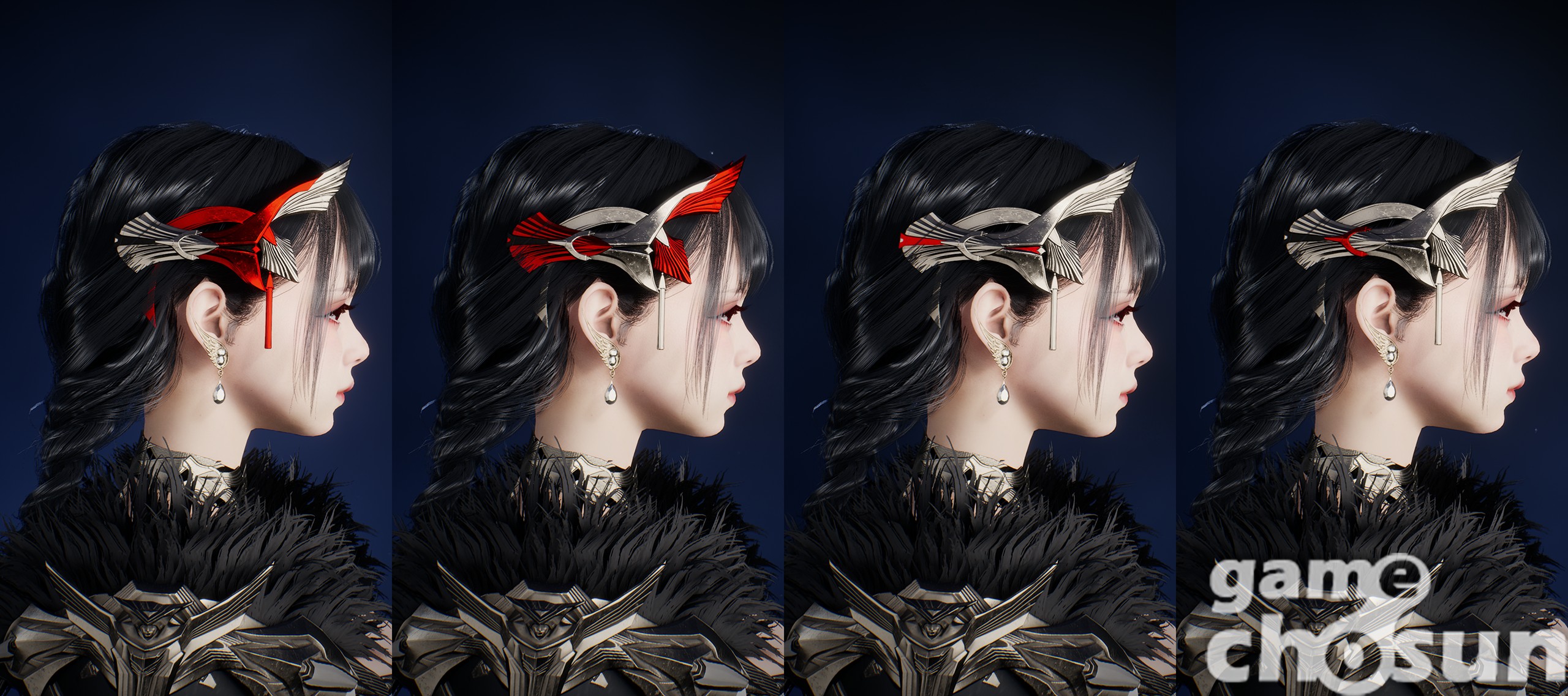 모자는 마치 월계관을 연상케하는 티아라다. 세련된 날개 모양으로 신발처럼 다른 의상과 매치하기 좋은 부위. 염색 부위가 4곳이라 꾸미기 좋은 것도 매력적이다.