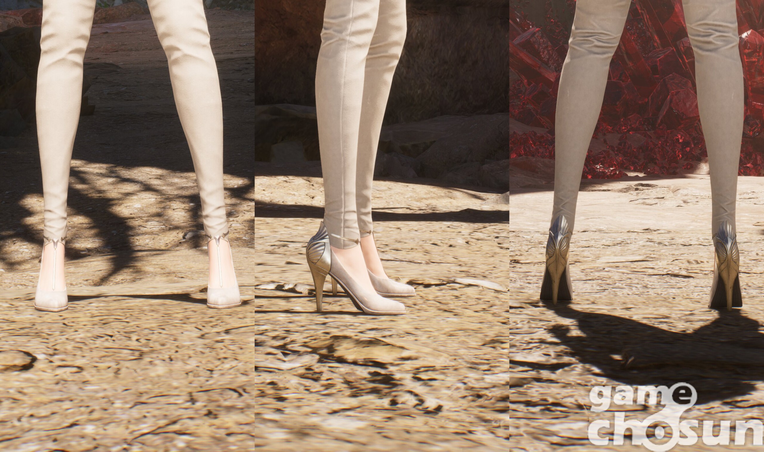 모자와 함께 다른 의상에 무난하게 쓸 수 있는 신발이다. 일반 높이의 하이힐에 날개 무늬 뒷굽으로 매력을 살렸다. 염색 부위도 4종류로 일반적인 하이힐 보다 조금 더 많은 편.