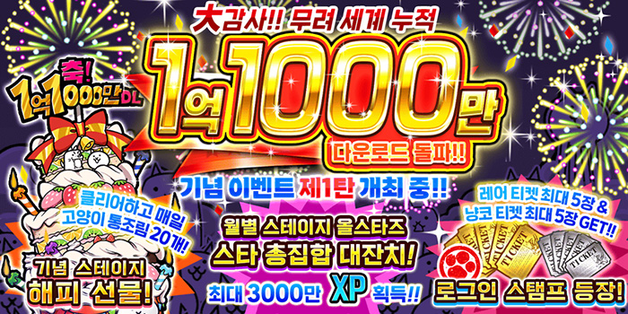 [자료제공 = 포노스] 주식회사 포노스(대표 츠지코 요리카츠)는 자사의 타워디펜스 게임 '냥코대전쟁'에서 12월 22일부터 누적 다운로드 1억 1000만 돌파를 기념하는 기간 한정 이벤트 제1탄을 개최한다고 밝혔다.