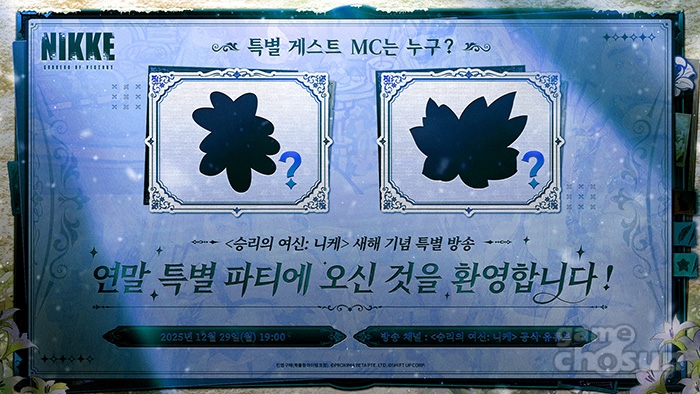 레벨인피니트가 서비스하고, 시프트업이 개발한 미소녀 건슈팅 RPG '승리의 여신: 니케'가 오는 12월 29일(월) 19시, 공식 유튜브 채널을 통해 새해 기념 특별 방송 '연말, 특별 파티에 오신 것을 환영합니다!'를 진행합니다. 또, 이와 함께 특별 MC들의 실루엣 힌트가 담긴 서스펜스 키비주얼을 공개하기도 했습니다.