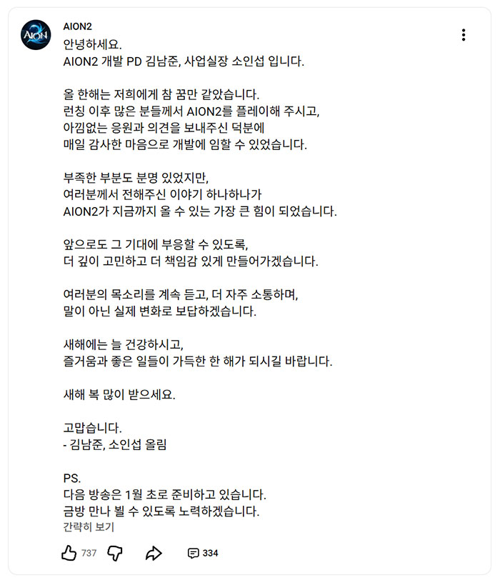 엔씨소프트의 MMORPG '아이온2'의 김남준 개발 PD와 소인섭 사업실장이 공식 유튜브 채널을 통해 새해 인사와 함께 2025년 소회를 남겼다. 또, 1월 첫 방송은 1월 초 준비 예정이라고 깜짝 선물을 남기기도 했다.