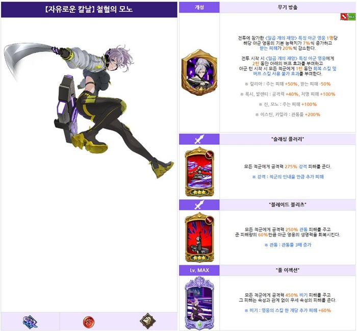 자유로운 칼날 모노의 스킬은 모두 적 전체를 타겟으로 하는 공격 스킬로 구성돼 있는데, 1번 스킬 '슬래싱 플러리'는 모든 적에게 강격 피해를, 그리고 2번 스킬 '블레이드 블리츠'는 모든 적에게 관통 피해를 주고, 준 피해량에 비례해 아군 전체의 생명력을 회복시킨다.