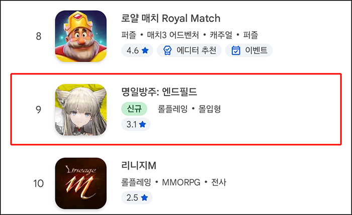 그리프라인의 '명인방주: 엔드필드'가 1월 25일 구글 플레이스토어 매출 9위를 달성했다.
