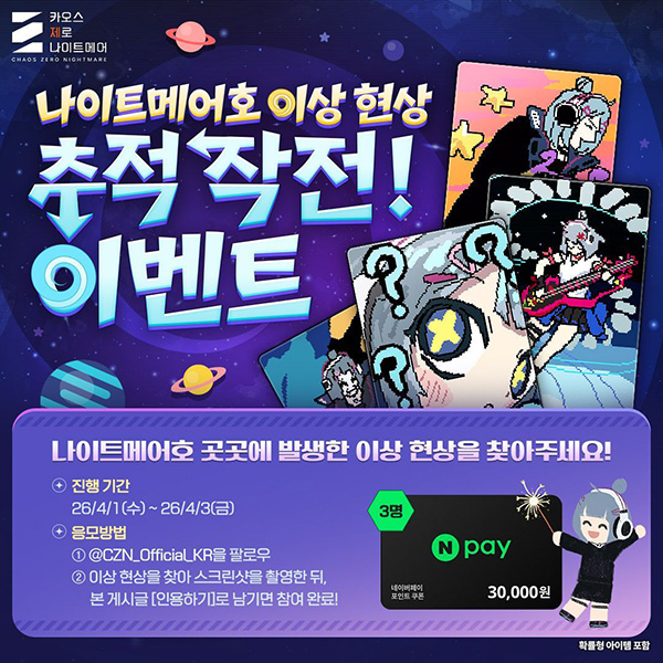 한편, 단순히 인게임 변화를 감상하는 것을 넘어, 유저들이 직접 '해킹'의 흔적을 찾아 제보하는 참여형 이벤트도 함께 진행된다. 공식 X를 통해 4월 3일까지 열리는 '나이트메어호 이상 현상 추적 작전'은 게임 곳곳에서 발견된 이상 현상을 스크린샷으로 촬영해 인용하기(Quote) 형태로 제보하는 방식이다.