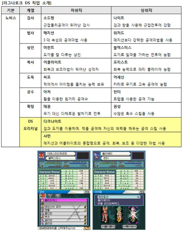 ▲ 온라인게임에서는 볼 수 없는 라그나로크 DS만의 오리지널 직업, 다크나이트와 샤먼