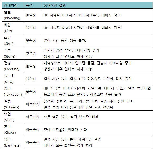 * 속성 공격 (마법 공격 등) - 마법, 스킬 등 속성 공격으로만 이루어진 공격 속성 피해를 적에게 준다. 속성 공격에는 불, 물, 빛, 어둠 등의 속성이 있으며, 속성 공격에는 출혈, 화상, 스턴, 결빙, 중독, 질병, 혼란 등 다양한 상태이상이 함께한다.