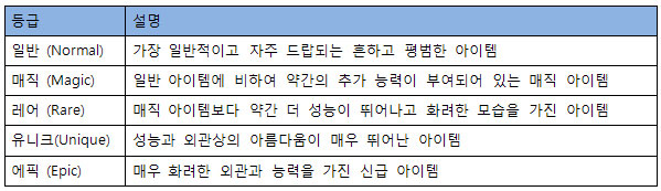 아이템은 가장 일반적으로 제공되는 일반 아이템과 추가 능력이 부여된 매직 아이템, 더욱 화려하고 능력이 뛰어난 래어, 유니크, 에픽 등으로 구분된다.