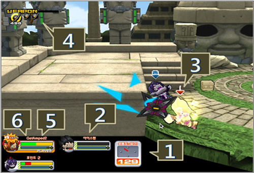 3. 팀 마크(팀 토너먼트 모드) : 팀 전의 경우에는, 캐릭터의 머리 위에 팀을 나타내는 마크가 표시된다. (색에 따라 홍팀, 청팀으로 구분)