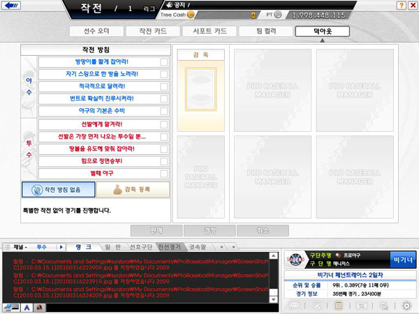 오는 25일 프리오픈베타테스트를 예정 중인 '프로야구 매니저'는 바로 이러한 묘미를 살려 만든 시뮬레이션 게임이다. 선수를 영입하고, 라인업을 구성하여 팀을 창단한다. 그리고 6일 동안 108경기가 열리는 리그에 참여하게 되는데, 여기서 중요한 것은 유저가 접속을 하든 안 하든 매시 정각이 되면 경기가 열리고 결과가 나온다는 사실이다.