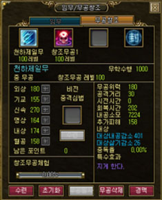 게임에 접속한 유저들은 캐릭터가 20레벨이 되면 자신만의 무공을 만들 수 있으며, 게임 내에서 얻을 수 있는 ‘무공비급’을 통해 무공창조 후 자신의 경험치를 투자하여 무공의 속성을 자신의 의지에 따라 높일 수 있다.