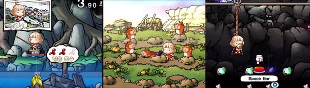 농장은 여러 곡식을 탐하는 두더지를 잡는 게임이고 낚시는 물고기가 미끼 근처에 오면 낚을 수 있으며 광산은 정해진 지역에 매달려 얻을 수 있다.