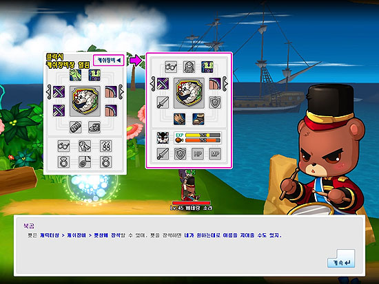 처음 <A오즈>를 접했을 때 게임 UI가 너무 깔끔한 나머지 게임과 살짝 이질감이 느껴졌지만 차츰 익숙해졌고 오히려 산만한 문양이나 장식이 있는 UI보다 메신저에 가까운 단순한 UI가 게임 몰입도에는 도움이 되는 느낌이었다. 무려 36개에 달하는 스킬 슬롯창은 스킬뿐 아니라 물약, 탈것, 감정표현 등 단축키를 넉넉히 설정하여 사용할 수 있었고 채팅창 분리나 크기 조절 HP와 MP바의 이동등 다양한 기능들이 눈에 들어왔다.
