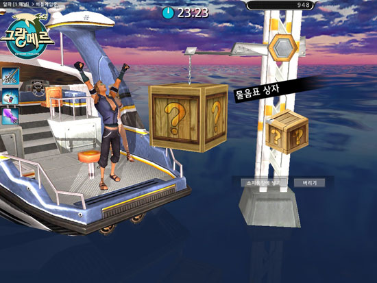 그랑메르 바다 속에는 보물이 숨겨져 있다. 캐치 성공시 Lucky 화면이 뜬다면, 최선을 다해 파이팅을 해보자. 랜딩에 성공 한다면, 행운상자를 낚을 수 있을 것이다. 행운상자를 배에 실은 후 소지품(단축키:I) 창을 열어 상자를 열면 각종 아이템을 획득할 수 있다.