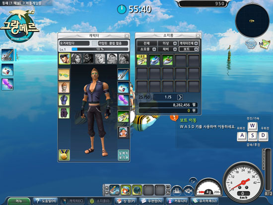 튜토리얼 NPC를 따라서 보트 이동, 낚시 방법에 대해 체험을 완료하면 게임머니와 경험치, 낚시에 필요한 장비를 보상으로 지급한다.