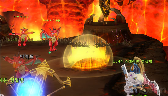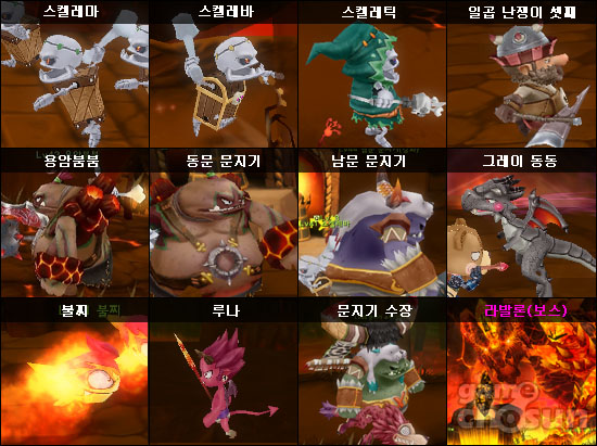 ↑ 마그마 던전 몬스터 일람 41~43레벨 사이의 해골이나 용암 덩어리 몬스터, 용 계열 몬스터가 등장한다. 그러나 특별한 목적이 없다면 몬스터는 무시한 채 달려서 최대한 빨리 라발론의 앞까지 가는 것이 일반적이다.