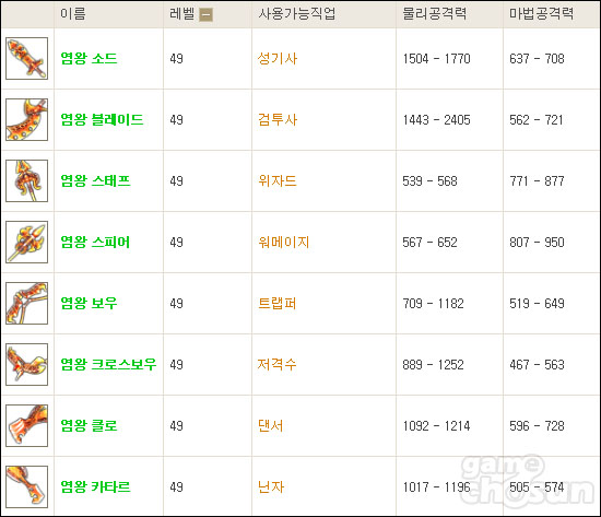 ↑ 착용 레벨 49의 염왕 무기 ☞ 용기사 - 염왕 소드 정보 보러 가기 |
