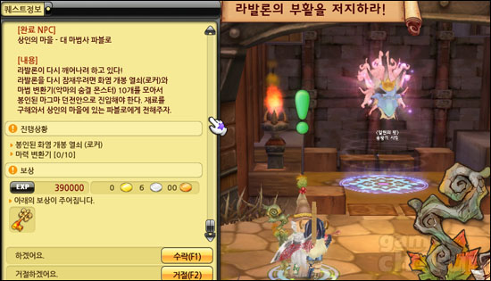 ↑ 마그마 던전 입장권 일일 퀘스트 화염문 개봉 열쇠를 구하기 위해서는 상인의 마을의 마법사 파블로가 주는 일일 한정 퀘스트인 '라발론의 부활을 저지하라!'를 수행하면 된다. 하루에 한 번 라발론에 도전할 수 있는 셈이다.