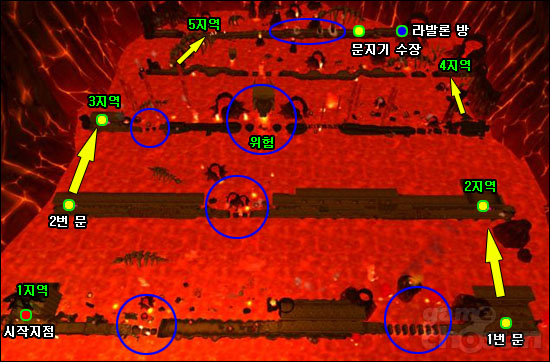 ↑ 마그마 던전 지도. 파란색 원은 주요 위험 지역 몬스터를 무시하고 달려도 되는 마그마 던전의 특성상 가장 큰 적은 몬스터가 아니라 위험천만한 지형과 함정이다. 이동 과정에서 점프 타이밍이 잘못되거나 약간의 방향키 조작 실수가 발생하면 즉각 용암으로 떨어져 체력에 200~300의 피해를 입는다.