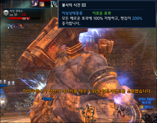 체력 회복을 막는 가장 좋은 방법은 마인 쿠마스가 방 중앙으로 이동하는 동안 쿠마스에게 창기사의 포획이나 정령사, 사제의 수면 등 스턴/메즈 기술을 적극 사용하여 이동을 멈추게 해야한다.
