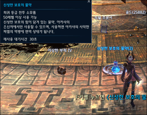 황금의 미궁에 등장하는 네임드가 드랍하는 신성한 보호의 물약은 한 번에 1명만 획득할 수 있는 소모품이다. 이는 상위 던전 아카샤의 은신처를 공략할 때 꼭 필요한 물약이다.