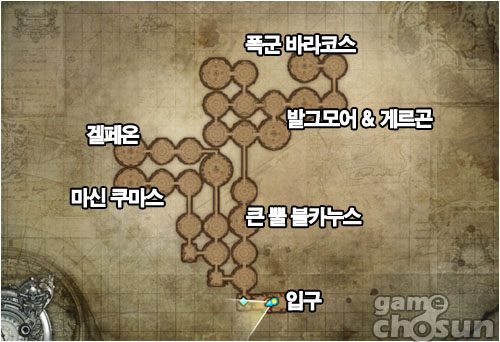 황금의 미궁은 마신 쿠마스 -> 겔페온 -> 큰 뿔 불카누스 -> 발그모어 & 게르곤 -> 폭군 바라코스 순으로 공략을 하게 된다.(겔페온 생략가능) 네임드 몬스터는 물론, 인던내 모든 몬스터가 상당히 높은 공격력을 지니고 있기 때문에 주의하여야 한다. (일반 사이즈의 몬스터에게 맞았을 때 1~2만 가량의 HP가 닳게된다.)