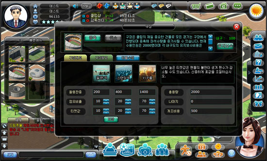 팀의 경기가 치르게 되는 가장 기본적인 단위인 경기장은 레벨 업을 통해 관객석의 수나 광고 수익을 증대시킬 수 있으며, 구장의 개조를 통해 광고수익 증대와 구장 광고 항목을 등을 업그레이드 할 수 있다.
