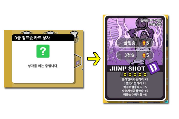 ▲ D급 점프슛 5등급 카드, 왠지 카드의 그림만봐도 불꽃 3점슛을 던질 수 있을 것 같다.