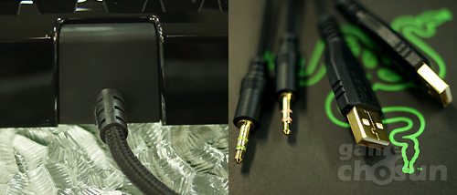 전체적으로 블랙풍에 하이그로시 광택의 상판과 레이저각인된 키캡은 고급스러움을 보여준다. 또한 USBx2, 오디오, 마이크 연결 케이블은 엉킴을 방지하는 합사케이블로 마무리돼 있어 완성도를 높이고 있다.