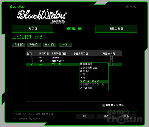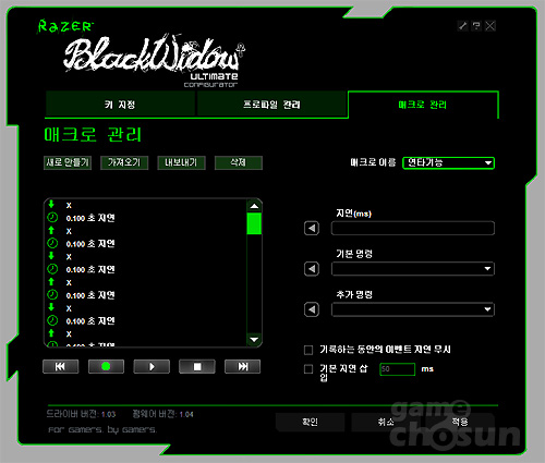 여기에 10개의 프로파일을 개별로 지정이 가능해, 게임별로 혹은 사용용도 별로 매크로키의 설정을 빠르게 전환하거나 기본 키의 입력조차 마음대로 바꿔 사용 가능하다.